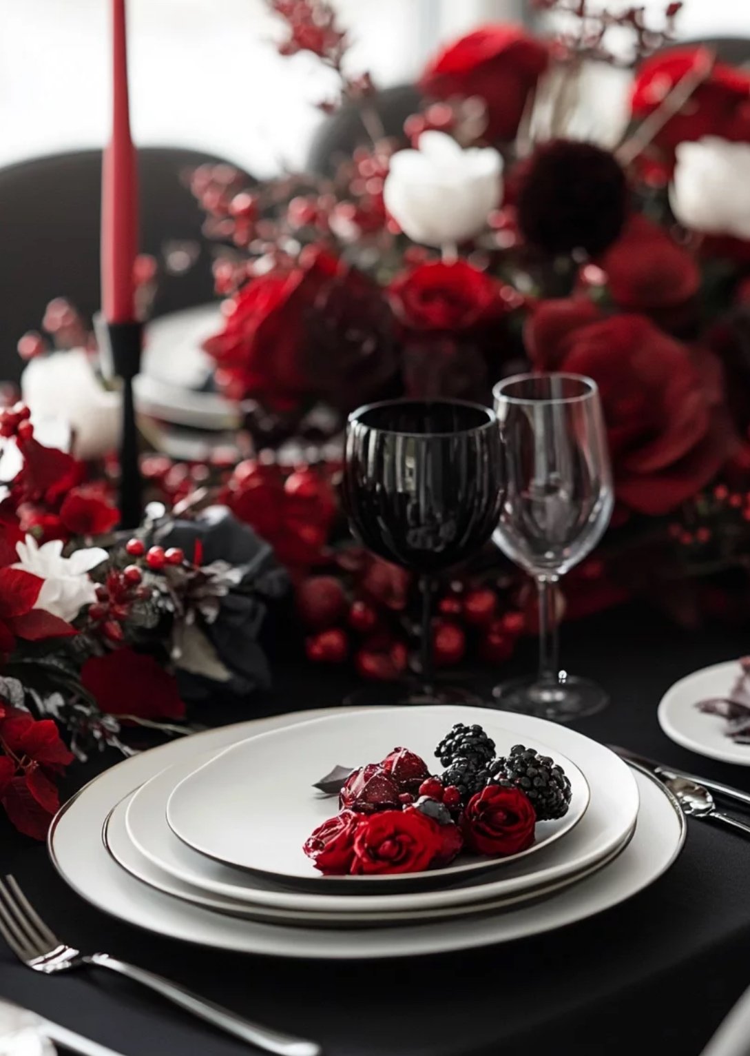 Cover tabletops with black velvet runners. Place silver goblets beside crystal decanters of red wine. Add gothic florals — dark roses and calla lilies with black feathers in ornate vases. A touch of wax-dripped drama completes the look.