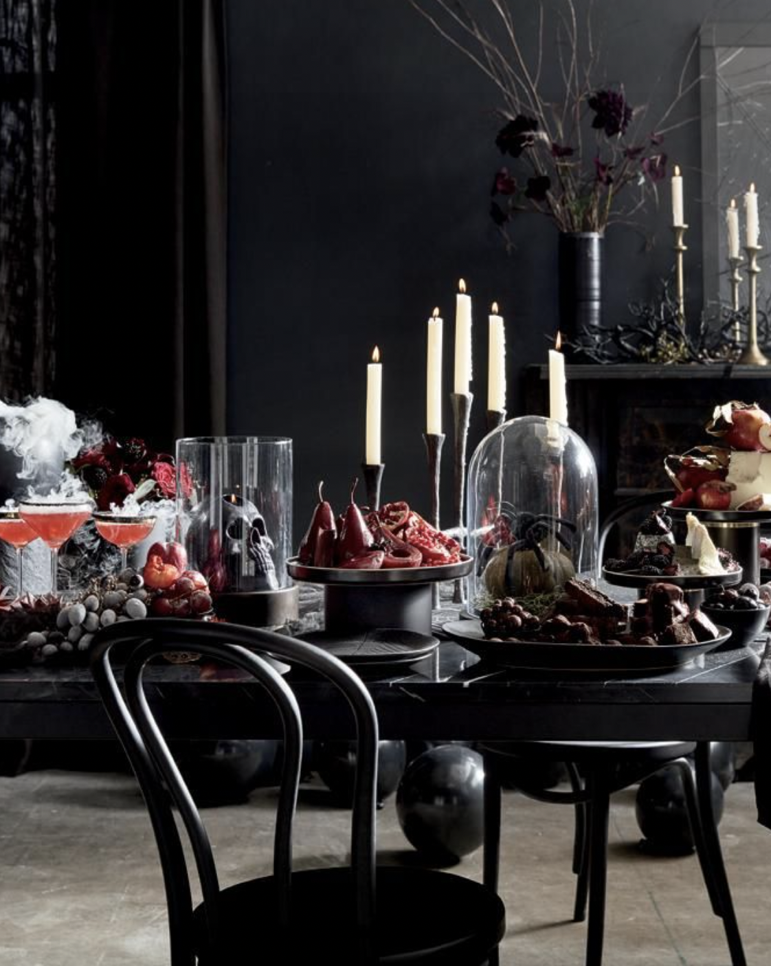 Add a touch of spectacle with edible décor: a dark chocolate fountain tinted with red cocoa butter to mimic “blood,” or deviled eggs dyed plum with activated charcoal and beets. Remember: a dish can be eerie without being inedible — chic Halloween entertaining means your food is as delicious AND spooky.