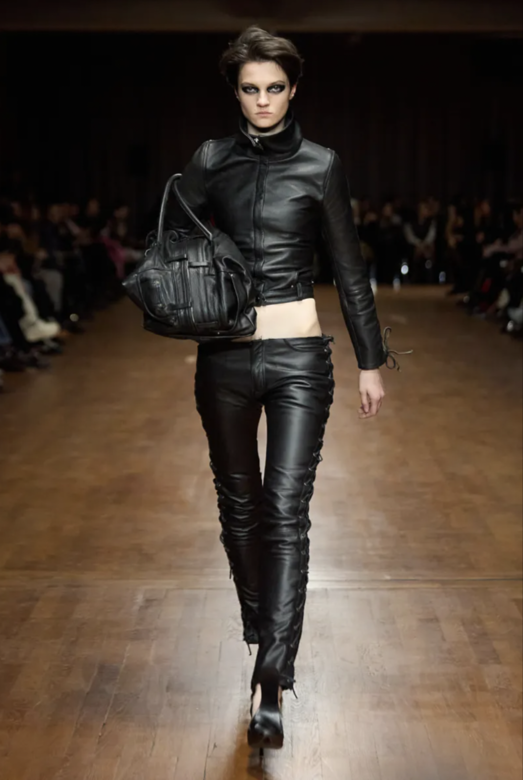 Balenciaga: sharply tailored leather jackets with corset inlay.