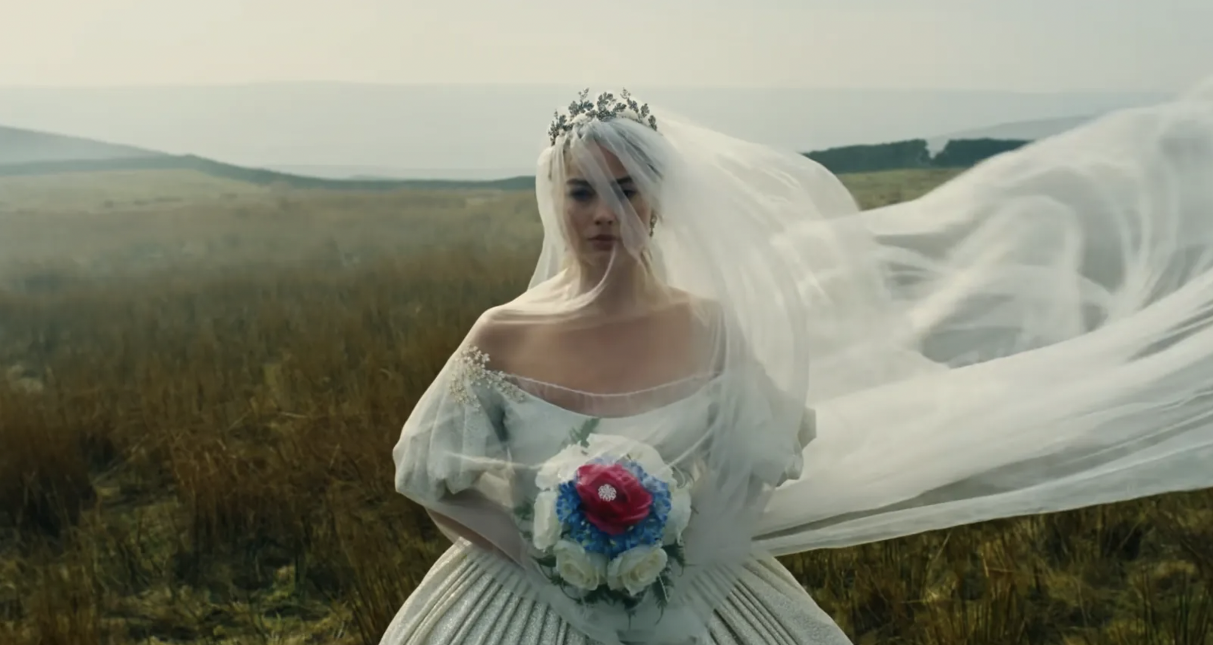 The airy silhouette and wind-lifted veil frame marriage as something beautiful yet unsettled, never fully anchored. In Brontëcore terms, commitment arrives without closure, dressed as inevitability rather than triumph.