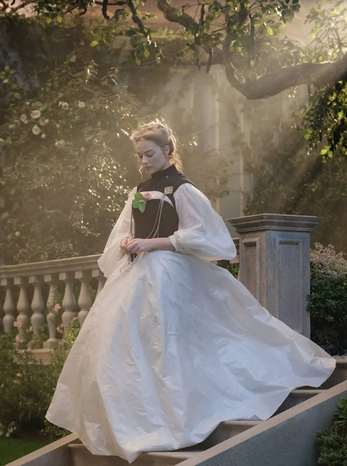 That unrest sits at the heart of the latest cinematic interpretation of the story, starring Margot Robbie and Jacob Elordi, where costume, loosely historically inspired, becomes an extension of emotional volatility, translating internal turmoil into silhouettes that move as though the wearer cannot remain still. Fabric loosens, hems lift, layers resist containment and colour appears with deliberate intention, echoing the Brontë sisters’ understanding that desire, grief and devotion rarely present themselves in perfect, polished uniform.