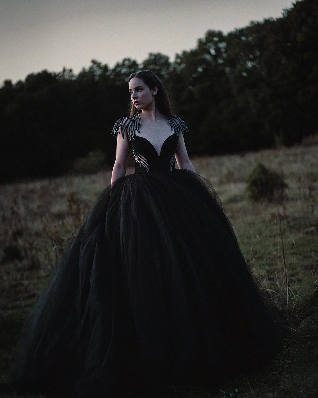 I think, again, that would be the story I aim to tell through my designs. The viewer senses that it’s not just a black dress, it’s a story written in fabrics. Emotionally, black brings a sense of darkness, mystery and power too. I think of my black Raven Queen, the Dark Angel and also of my Witch dress. All of these dresses have been made in other colours, but black gives them the most mystery.