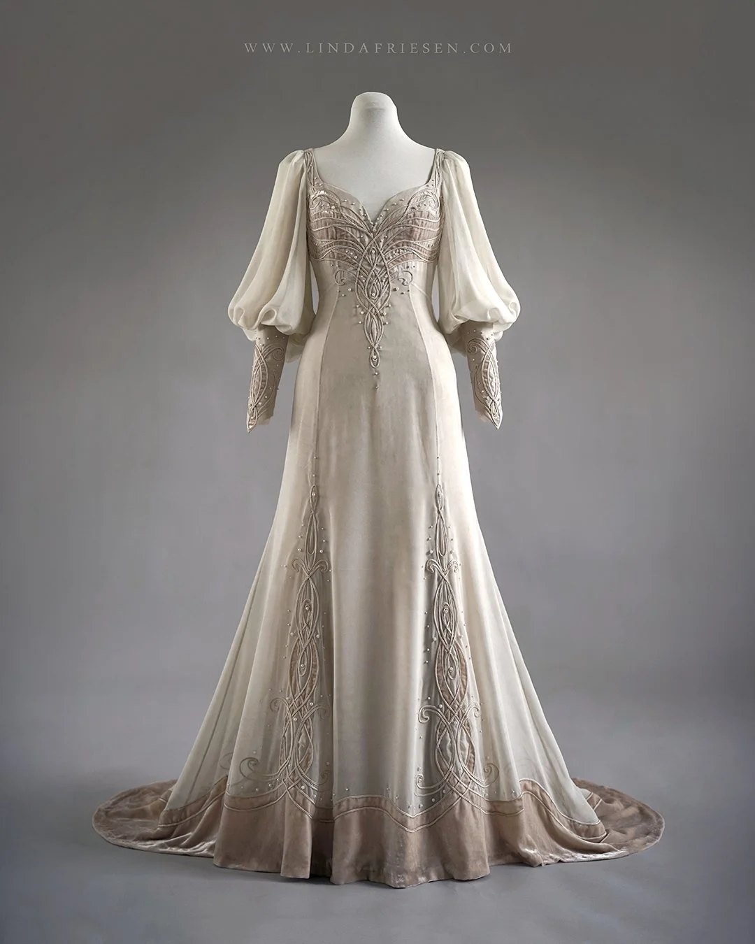 That atelier, our atelier, belongs to Linda Friesen, a designer whose work reads like myth rendered in real-life. From her studio, Friesen creates gowns shaped by historical memory, narrative imagination, fantasy, fairytale and a romantic gothic sensibility that allows fantasy to coexist with expert craftsmanship.